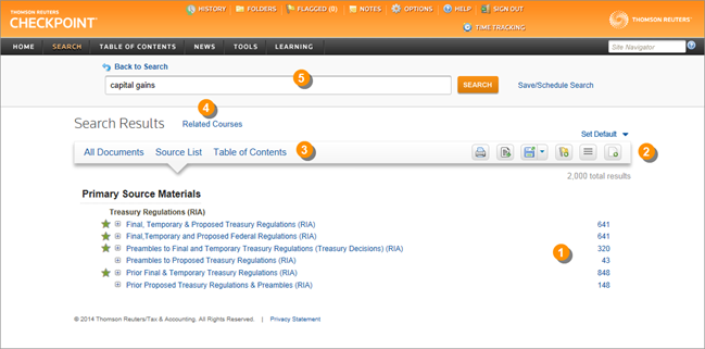 Change the Search Results view to All Documents to list all documents in which your search found keywords. Change the view to Table of Contents to see a list of the sources you selected for your keyword search in the order they appear in Checkpoint's Table of Contents and how many documents within each source contain the specified keywords. |